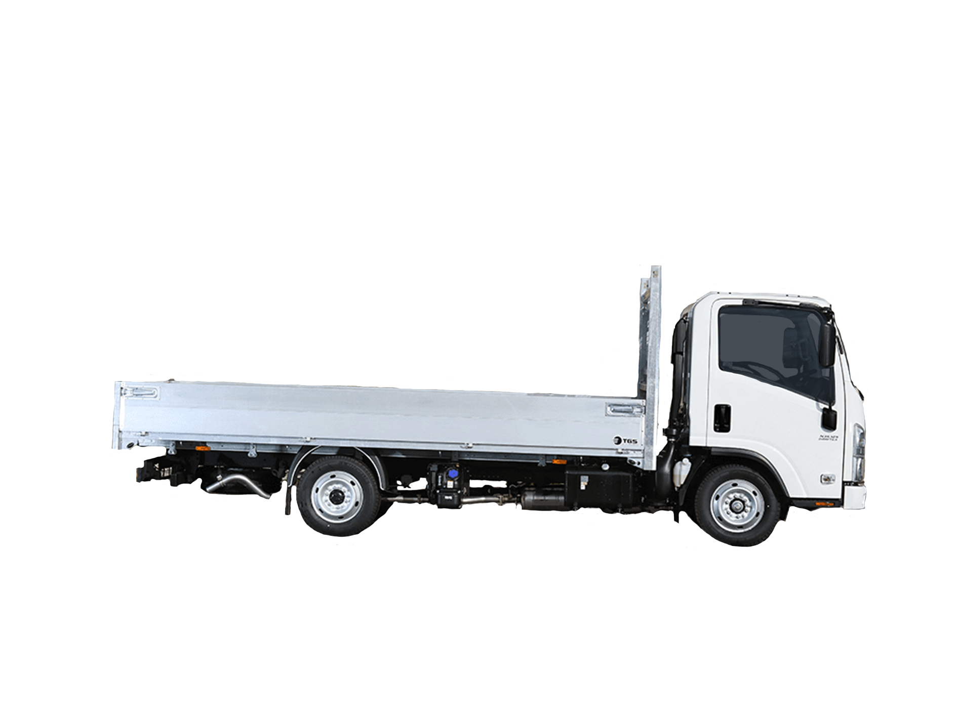 • Profile: Rigid chassis cab with single rear wheels and dropside body.